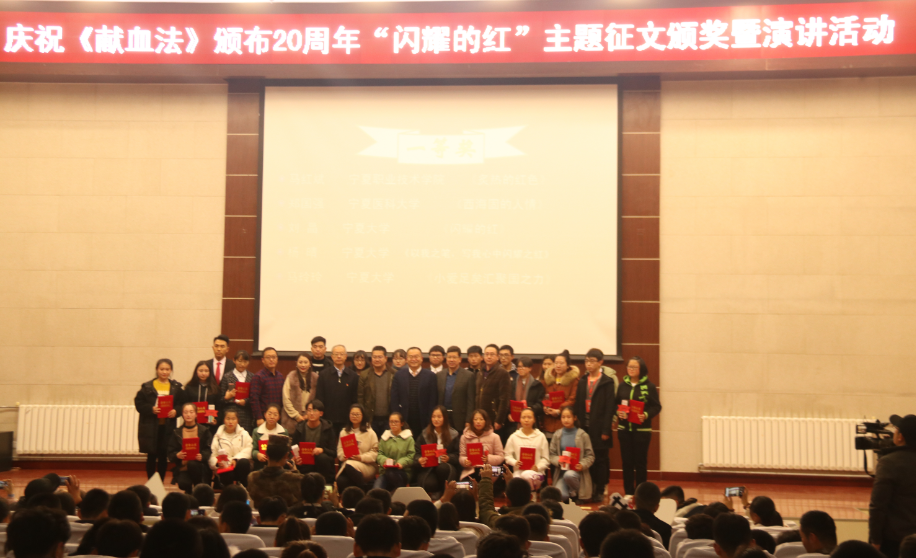 活动上,自治区卫健委医政医管处处长张波致辞,张波讲到,自1998年《献血法》实施以来,在各级政府部门大力支持、社会各界的共同努力下,我区无偿献血工作取得了显著的成绩。年累计接待献血者从1998年5千多人增加到2018年6万余人;年采集量从1998年2吨增长到2018年近25吨;献血点从一辆流动采血车发展到现在遍布全区的献血服务网络的覆盖,为满足临床用血需求,保障全区人民身体健康奠定了坚实基础。但随着卫生健康事业的发展,医疗技术的不断提高,医疗机构的规模及数量不断增加,还需要更多的爱心人士加入献血队伍来保障临床病患的血液供应。宁夏血液中心副主任张伟宣读了《关于表彰庆祝<献血法>颁布20周年主题征文获奖者的通知》,在自治区教育厅的大力支持下,宁夏血液中心组织银川地区各大中专院校开展了“闪耀的红”主题征文活动。活动开展以来,各院校高度重视,积极响应,高校学生踊跃参与,先后有7家学校投送稿件506篇,经相关部门人员初审、复审后,最终评出一等奖5篇、二等奖10篇、三等奖20篇、优胜奖50篇,广大学生围绕自己的献血经历、亲历的用血事例、身边的献血故事颂扬献血公益精神,赞扬无私奉献行为,共同发起献血倡议。再次用创作手法弘扬了献血理念,进一步培养和提升了高校学生的责任感和使命感。参会领导分别向获奖者颁发了荣誉证书。