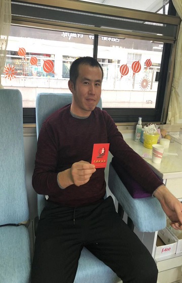 在工作人员的指引下,他把手提的袋子一一放好。紧接着掏出身份证认真的填写者献血征询表。原来,他是一位山西来江西务工的农民工,名叫元继峰。这次是从南昌转车回太原,看到献血车就急忙提着行李过来了。在一系列的体检化验合格后,他毫不犹豫地献血400ML。“拿着这个本本,对我个人而言多少是份安慰吧!我老婆快要生小孩儿了,看过许多因为生孩子会有大出血风险而需要用血的新闻报道,想着自己献血除了是一份保障,即使没用,也可以给其他需要用血的产妇带去一份希望吧!”拿到献血证后的他语重心长的说着。在离开时,一再表示今后只要身体合适,一定会再献血的。