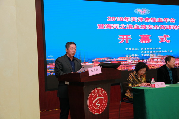 市卫健委副主任杜洪印、市卫健委医政医管处处长刘先夺、市医药学协会管理办公室主任熊智、市输血协会理事长张荣江、天津医院纪检书记尹俊新、中国人民解放军总医院输血科主任汪德清等领导莅临年会开幕式,市血液中心党委书记、主任,市输血协会理事长张荣江致开幕词,天津医院纪检书记尹俊新致欢迎词,市卫健委副主任杜洪印做了重要讲话,提出三点要求,一是要落实临床用血法律法规;二是要借助信息化手段,提高临床输血监管能力;三是要推广输血新技术,建立临床输血评价和改进体系。我市临床医疗机构和采供血机构近300人参加了年会。