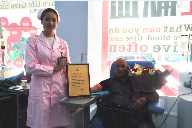 据统计,李建寿多年来共捐献了全血8次,合计3200毫升;机采血小板37次,共计73个治疗量;累计无偿献血45次,献血总量达17800毫升。为感谢他为百色市无偿献血事业做出的突出贡献,百色市中心血站向李建寿颁发感谢状,感谢他多年如一日坚持无偿献血,随后又向李建寿赠送了一束鲜花,提前祝他60周岁生日快乐。