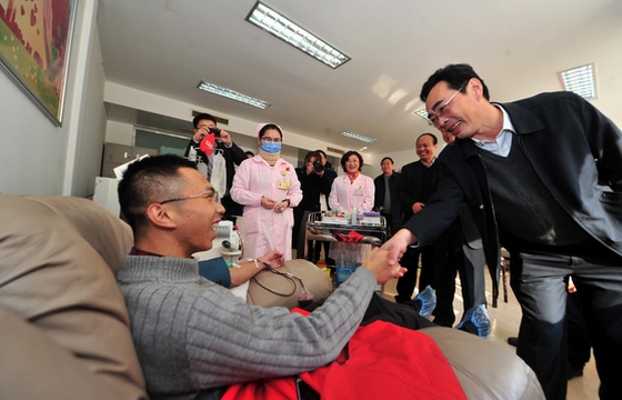 王汝鹏在省红十字会张青的陪同下看望前来献血的志愿者
