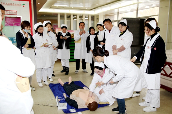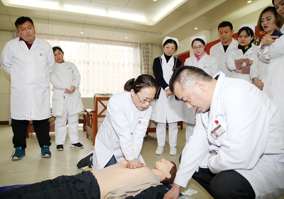 血源科主任曲小娜示范心肺复苏操作要点和注意事项(于瑞杰 摄影)