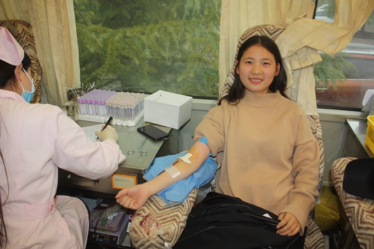 在陕西工业职业技术学院组织开展的冬季无偿献血活动中,市场营销班的吴霞毫不犹豫地填表、体检、很熟练地献血200毫升。