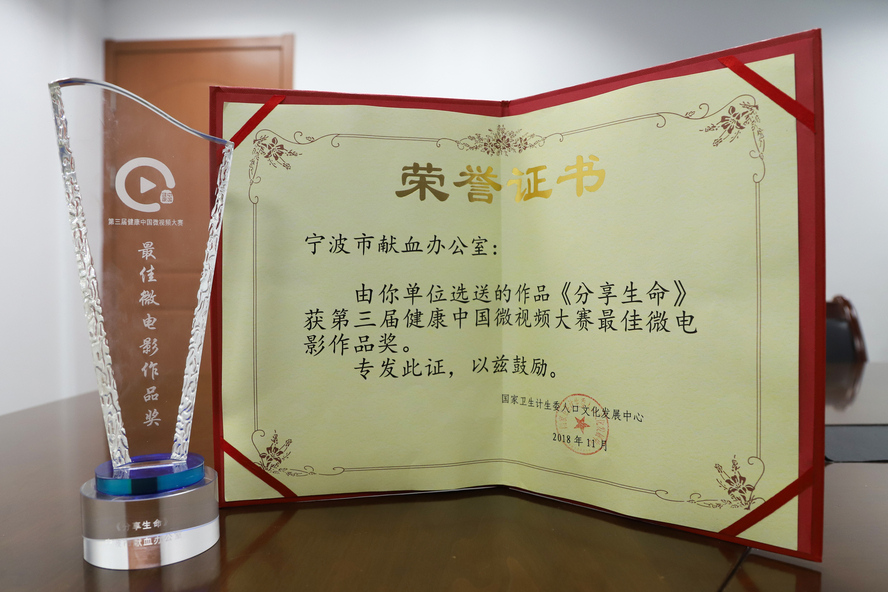 11月29日,第三届健康中国微视频大赛揭晓仪式在北京举行。宁波市《分享生命》无偿献血微电影因独特的视角、鲜明的主题、反转式的拍摄手法,荣获此次大赛最佳微电影作品奖。