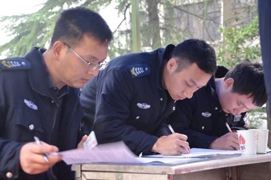 工行大队一行人赶到现场,陆建军(左一)正在填表登记