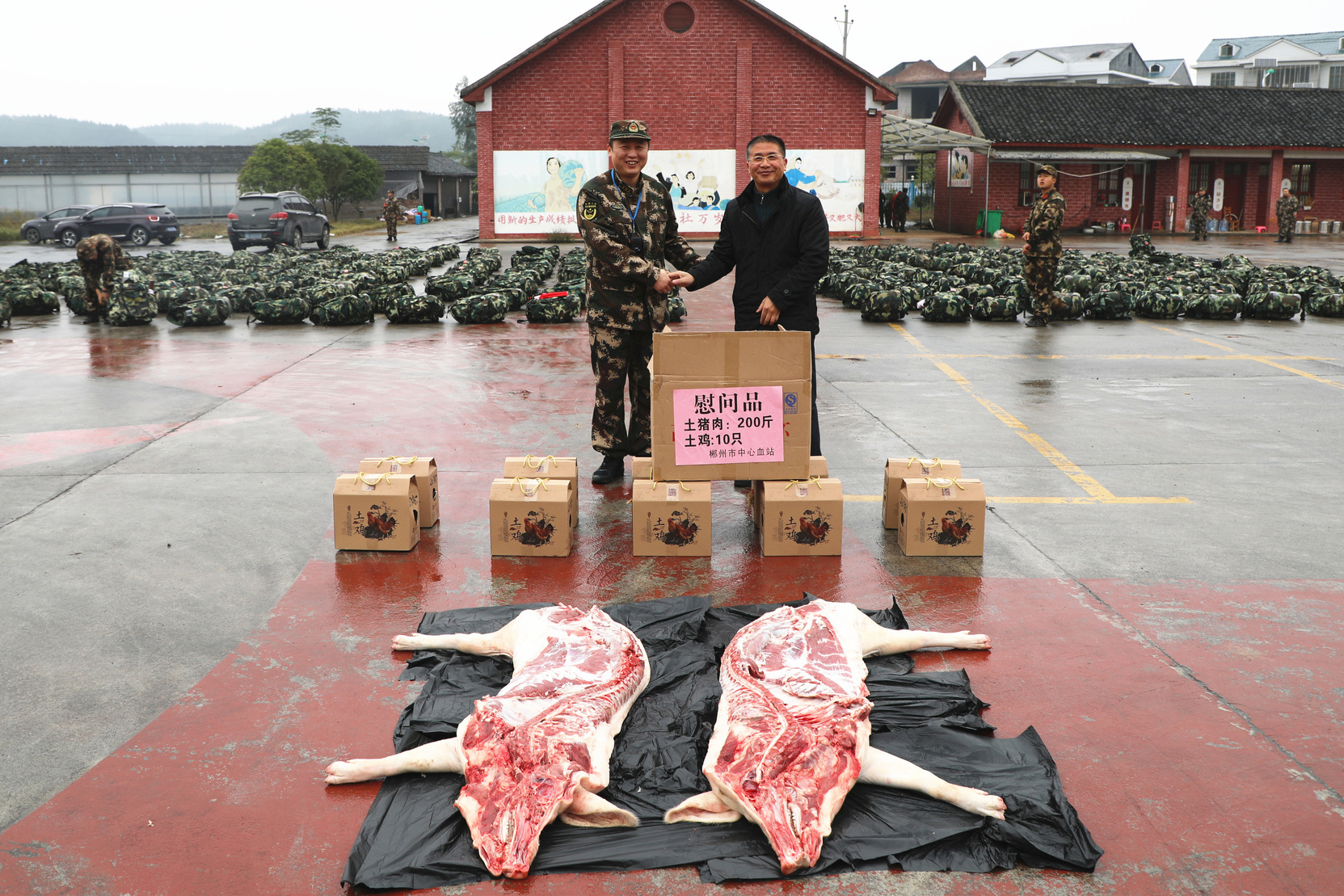 (通讯员 李娟)12月15日,郴州市中心血站党总支书记周小忠,副站长史艾娟来到武警湖南总队新训四大队新兵野营拉练休息点,向部队官兵长期以来对郴州无偿献血工作的支持表示衷心的感谢,并带去了特地从精准扶贫联系点宜章县笆篱镇洛角塘村采购的200斤土猪肉和10只土鸡,让官兵们感受到了冬日里最温暖的问候。