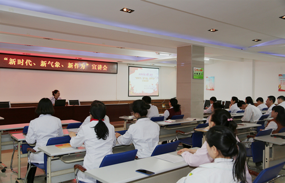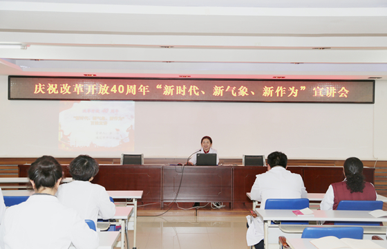 2018年12月14日,通辽市中心血站组织开展“新时代、新气象、新作为”纪念改革开放40周年理论宣讲活动,血站站长金洁主讲,全站职工参会聆听。