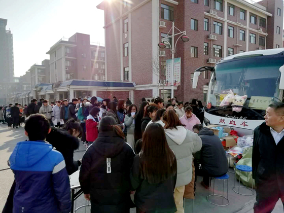 山东力明科技职业学院泰安校区的大学生们在采血车前排起50米长龙(徐园园 摄影)