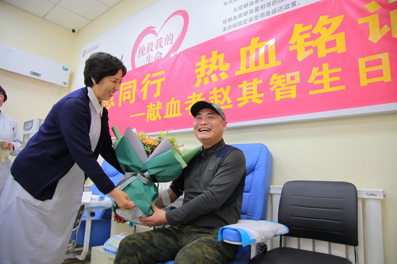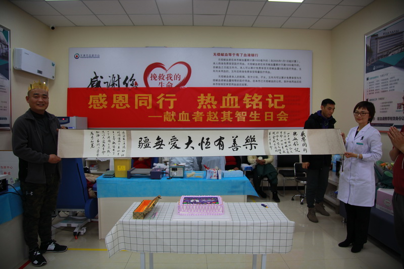 像往常一样,赵其智先是进行抽血化验,很快检验合格后,他坐在采血椅上开始献血,当周围其他献血者得知他就是生日会的主角时,纷纷为他送上生日的祝福和钦佩的目光。采血过程非常顺利,短短几分钟就采血完毕,体采科负责人为他送上鲜花和精心准备的生日礼物,还为专门请人为他提写了一副“乐善有恒 大爱无疆”的书法,装裱好送给他。赵其智不断地说:“太隆重了,真没想到,太感谢了……”