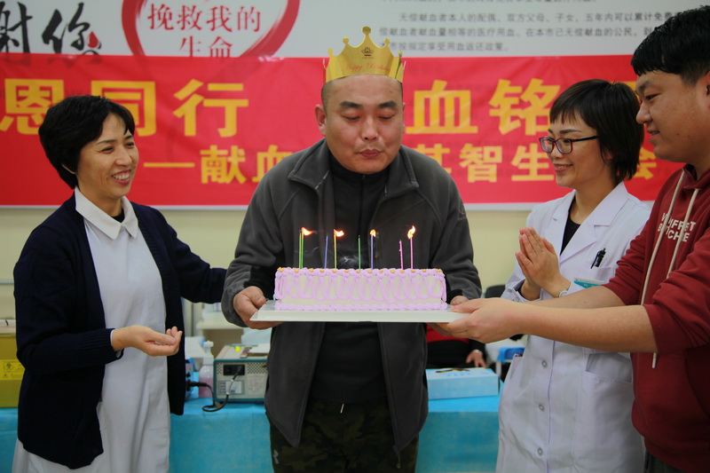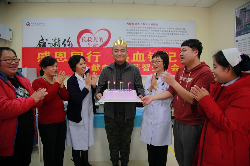 12月21日,静海献血屋内热闹非凡,这里正在举办一场特殊的生日会。献血者赵其智用人生中第40次献血来纪念他40岁的生日,在这有特殊意义的日子里,天津市血液中心工作人员精心为他准备了生日蛋糕、鲜花以及生日礼物,医护人员和献血者们共同为他唱起生日歌,使他度过了一个最难忘的生日。
