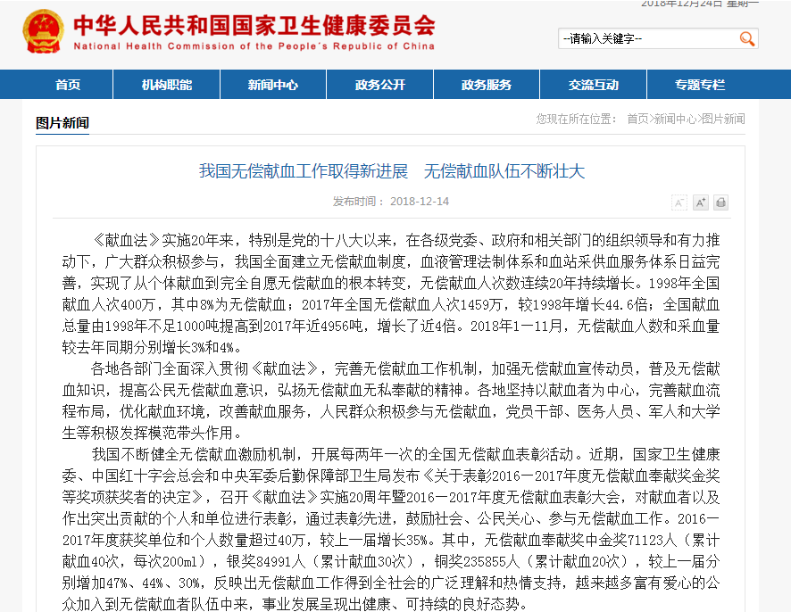 12月23日从市中心血站传来喜讯,国家卫生健康委员会、中国红十字会、中央军委后勤保障部卫生局12月13日在北京召开了《献血法》实施20周年暨2016年至2017年无偿献血表彰大会,旨在对无偿献血工作中做出突出成绩的先进个人、单位和省市予以表彰。会上,九江市获得2016-2017年度“全国无偿献血先进城市”荣誉称号。至此,九江已连续四届蝉联此荣誉。据介绍,“全国无偿献血先进城市”称号是我国对无偿献血事业表彰的最高荣誉。在此次表彰中,九江市获无偿献血奉献金奖246名、银奖408名、铜奖1158名。此外,中国石化九江分公司荣获无偿献血单位促进奖,黄捷、周水桃两位无偿献血志愿者获无偿献血志愿服务终身荣誉奖,欧阳志亮荣获无偿捐献造血干细胞奖奉献奖。