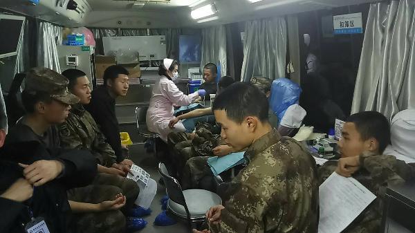 献血现场,官兵们在医护人员的引导下,有序地排队进行填表、体检。他们当中有的是第一次参加无偿献血的新兵,也有的是多次献血的老兵,他们都勇敢无私,毫不犹豫地伸出自己的手臂,为病人送去生命的希望。