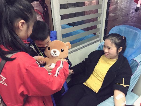 (曹金蕾在孩子们的陪同下参加无偿献血)