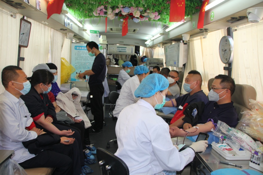 献血现场忙碌有序,山钢青年职工依次排队进行身份登记、血压测量、体格检查等献血前的必要程序,检查合格后,一一登上采血车。