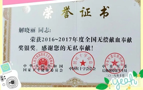 从2009年第一次参加献血至今,解晓丽累计参加献血47次,献血量达11800毫升,其中捐献血小板34次 6800毫升,全血13次 5000毫升。这些闪亮的数据和十多年的献血历程表明她是一位“资深献血者”。
