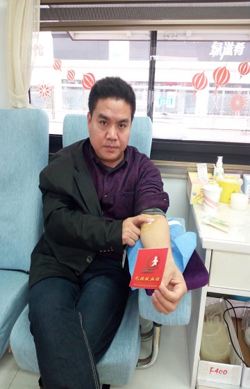 在位于南昌火车站西广场的采血车,刚上班不久,一位中年模样的男子左手提着提包,右手拎着个水桶,水桶里面放着一个装有生活用品的袋子走上采血车。他不紧不慢地放下手中物品,并从包里取出之前的献血证。很淡定地说道:“我献血。”征询中知道,他叫谭明德,来自湖南株洲,在南昌从事司机这个职业已有3-4年了。这次是她在南昌的第三次献血。“13年开始我就在我们株洲献血了,来到南昌,之前没碰到献血车,就没献。直到看到这里有献血车,回家只要经过这里到献血时间都会来献血。”熟练地经过体检化验合格,由于坐车怕太劳累,献血300ML。“我本来也是学医的,对一些医学知识也知道一些。只是因为98年我母亲做手术需要用血,知道用血的艰难。也因为手术费用花费大,所以在2000年时我转行成了一名职业司机。因为了解献血不影响健康,还可以帮助手术中急需用血的病患,直到后来,有一次在我们那儿碰到献血车就上去献血了,一直到现在,每年坚持献血1-2次吧!”献完血后的他真诚微笑的诉说着献血经历。最后离开时,也表示半年后有时间碰到一定会再次参加献血。