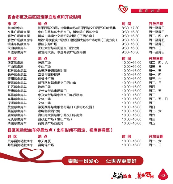 在此特殊时期,河北省血液中心呼吁广大健康适龄公民捐献热血挽救生命,如果您两周内未感冒发烧,没有疫区旅居史和密切接触史,请您为爱行动,捐献热血,为爱逆行!同时,希望机关企事业单位、社会团体、行业组织,积极组织团体,积极响应无偿献血活动,用无偿献血的方式为抗击疫情做出贡献。石家庄市区、县区各采血点正常对外开放,广大市民可以关注河北省血液中心微信公众号进行献血预约,企事业单位、爱心团体组织集体献血活动欢迎拨打电话0311-87811355,预约成分献血欢迎拨打电话0311-87815714,0311-87044306。