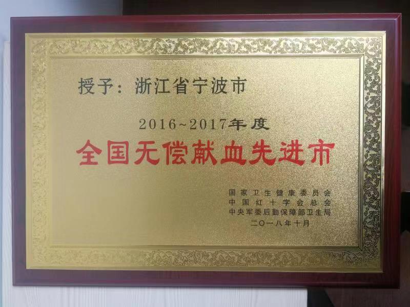 国家卫生健康委员会日前公布了《关于表彰2016-2017年度无偿献血奉献奖金奖等奖项获奖者的决定》,宁波市荣获2016-2017年度全国无偿献血先进市荣誉称号,这是我市