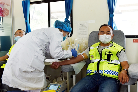 服务队党支部书记吉忠参加献血(马克 摄影)