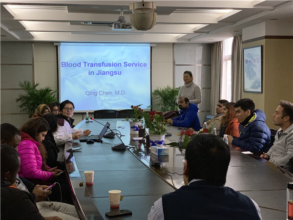 1月4日,南京医科大学公共卫生学院MPH专业的部分留学生来江苏省血液中心参观学习,输血研究室陈青副主任负责授课讲解。