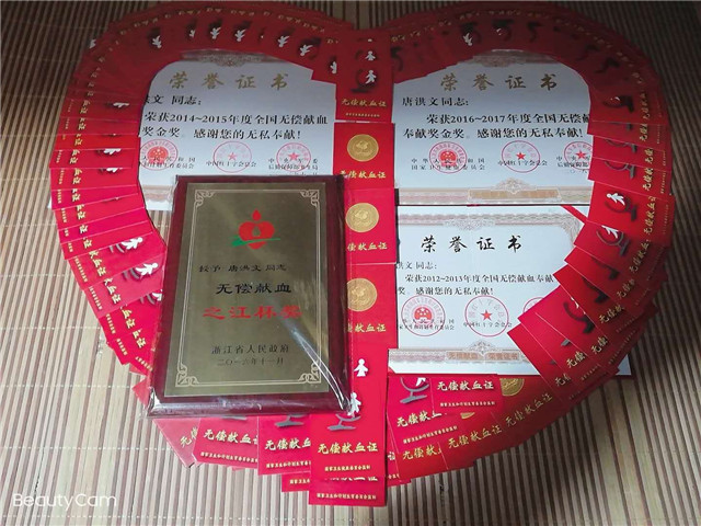 这些年来,他也收获了不少荣誉:全国无偿献血奉献奖(金奖、铜奖),浙江省无偿献血之江杯奖等,同时,也是《浙江省无偿献血荣誉证》获得者,可享受浙江省的“三免”优惠政策。