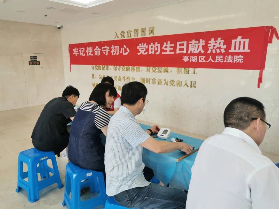 当天下午,盐城市亭湖区人民法院组织党员干警开展献血活动,以实际行动弘扬“奉献、友爱、互助、进步”的传统美德。广大党员干警踊跃报名,积极参与,整个献血过程有条不紊、秩序井然。当天共有35人成功献血,累计献血量达8900 毫升.每一袋鲜红的热血都流淌着党员干警热心公益、无私奉献的谆谆深情,也体现了不忘初心,服务人民的社会责任感。