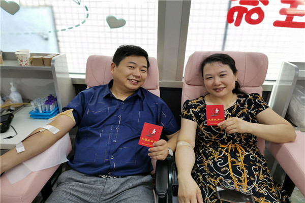 株洲市田心中学教师夫妇刘太平(左)、赵小云(右)一同参与献血。赵老师自豪地说:“我俩每年都会参加献血,家里献血证都有好几本了。作为一名人民教师,用实际行动告诉孩子们献血无损健康、还可挽救生命,是非常有意义的。”