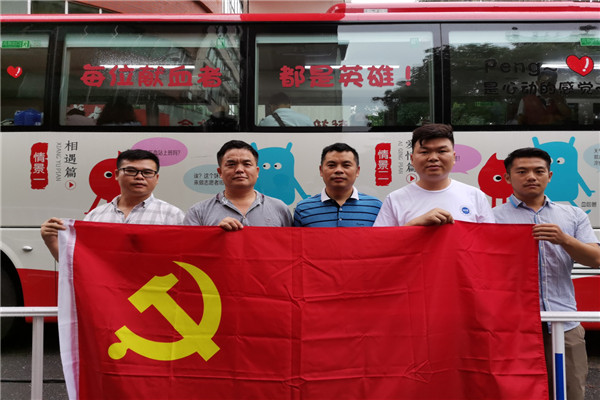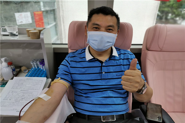 株洲南雅实验中学副校长刘云贵带头献血。他说,无偿献血是一件利国利民利己的大好事,作为一名共产党员更应该身先士卒。随后他和一起献血的老师们在党旗下合影。