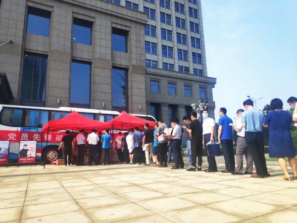 7月1日上午8点,上班时间还没到,已有不少机关干部、党员来到停放在市级机关综合办公大楼、阳光大厦的两处流动采血车前,有序排队等待献血。