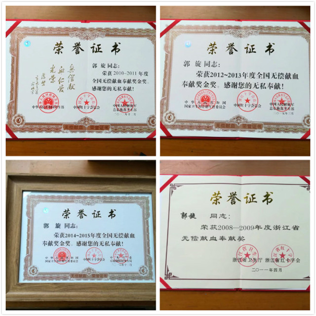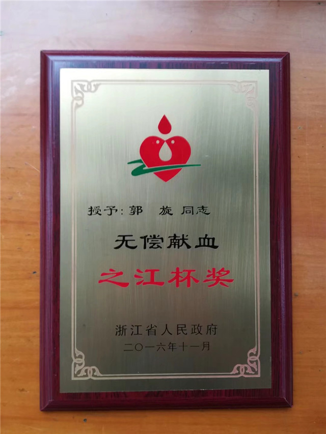 郭旋,曾荣获浙江省无偿献血之江杯奖