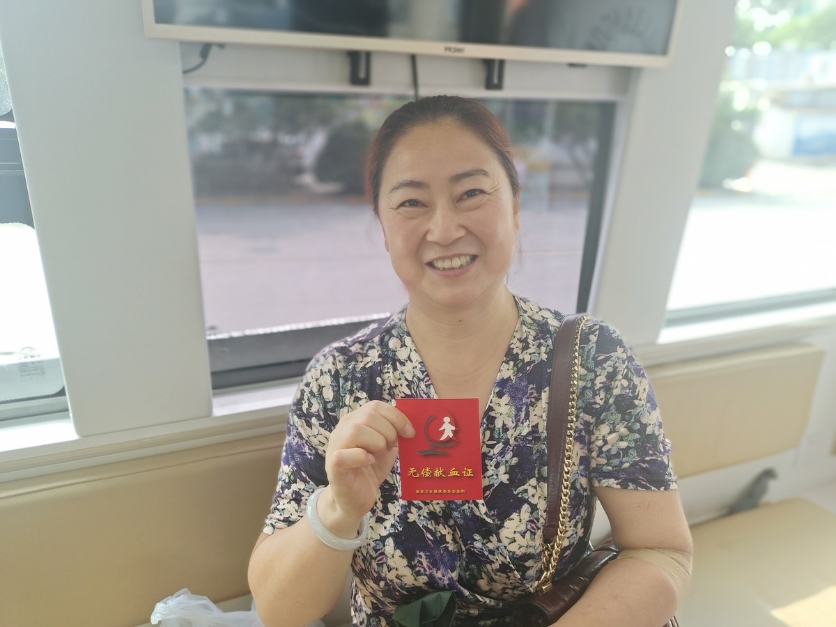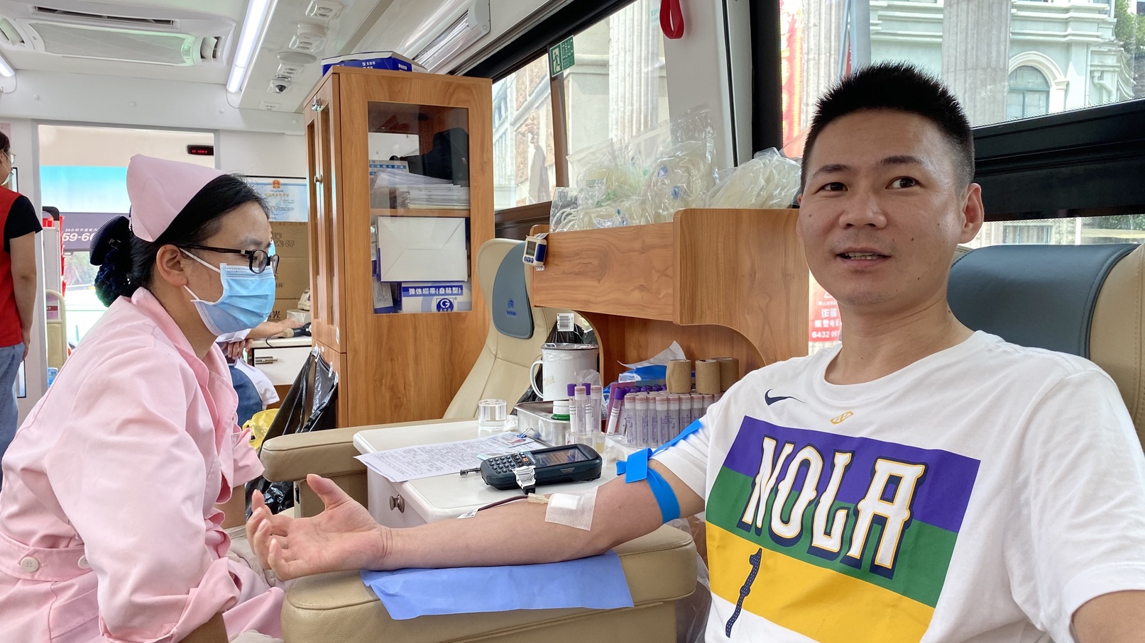 第四次献血的赵大路是香江社区的居民。今天下午他回小区时刚好看到我们的献血车,便径直过来加入到无偿献血的队列中。他说:"我走过来时刚好看到,就想着过来贡献点自己的力量嘛。之前在单位参加过无偿献血活动,今年受到疫情影响就被耽搁了,但是我们自己公益的心要一直在路上。每次拿到献血证我都会感到由衷的开心,这说明我的血液可以帮助到别人了。”赵大路说道。