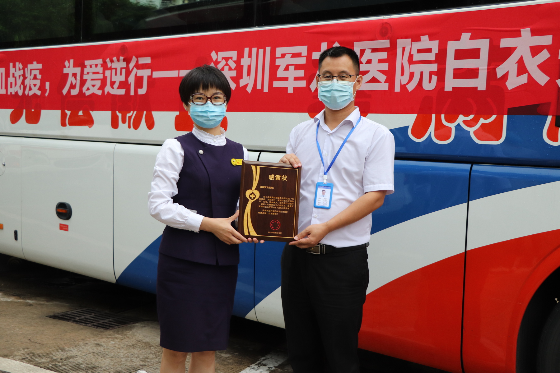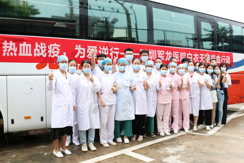 2020年8月18日,深圳军龙医院积极响应“白衣天使捐血月”活动,30名职工在院领导带领下,齐聚于献血车前参加无偿献血活动。