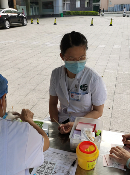 早上八点,江西省血液中心采血车应约到达医院急诊楼门前。前来献血的医务人员已经提前排队等候参加无偿献血。在工作人员的指导下,大家进行着资料登记、体温测量、健康检查、血样化验等流程。体检合格顺利通过的医务人员高兴地来到采血处,自豪地撸起袖子,献出自己的一份爱心。