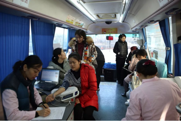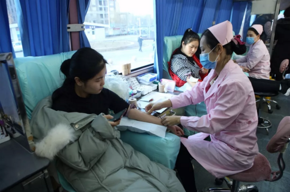 正值隆冬时节,寒气逼人,但在医院门诊楼前献血车上,前来献血的党团员们却热情高涨,在医务人员的引导下,认真的完成着填表、体检等献血前的程序。