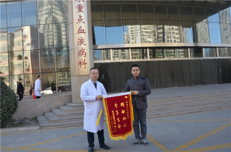 图为石家庄平安医院副院长徐强接过无偿献血锦旗