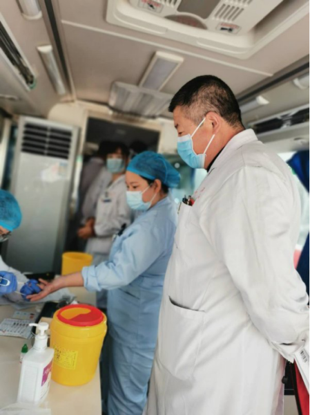 当日上午10时,当市中心血站献血车缓缓停在曹县磐石医院门口后,医院的医护人员便一边帮忙搬运东西,一边协助散发宣传资料、指导医护人员及周围群众有序排队,填写献血登记表格、测量血压、抽血化验等。在献血的队伍中,有刚刚下了夜班没有回家的,有正在休假特地从家里赶过来的,也有像门诊部主任丛承利、收款员徐晴这样连续献血9年、总献血量超过5000毫升的“献血达人”。曹县磐石医院每年都会开展两次无偿献血活动。检验科的主任王又领是第一个填好资料无偿献血的。在检验科工作的他每天都会给患者抽血、验血,但是对于别人检验自己的血液他还是表现得很紧张。旁边的同事取笑他:“你天天抽别人的血怎么就不怕疼呢,现在扎一下自己就害怕了吧。”王又领笑着回答道:“我最怕的就是扎那一下,后面抽血就不紧张了。”几个人说笑的时候,血袋里面就已经半袋血了。对于王又领来说,验血、抽血就像是每天呼吸一样,是他每天重复千百遍的工作。