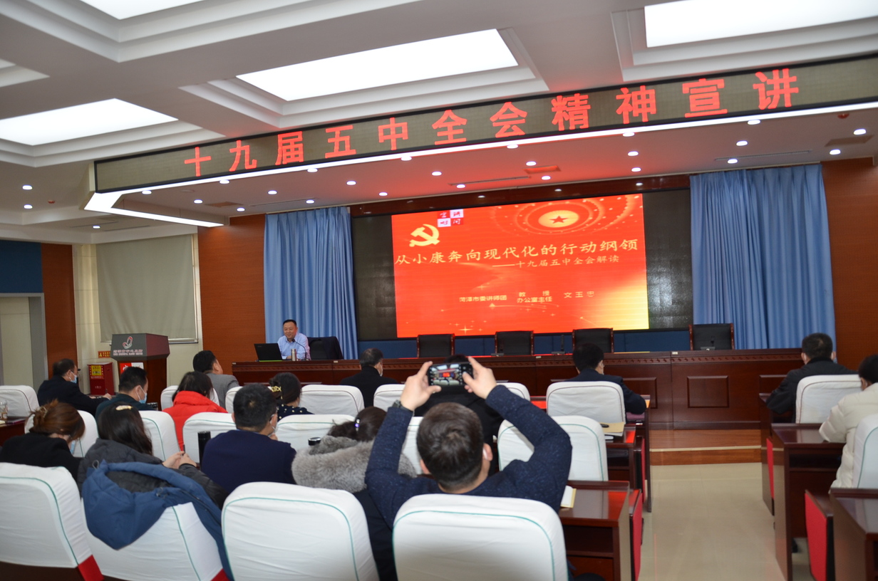 文玉忠教授指出,党的十九届五中全会是在我国即将全面建成小康社会、实现第一个百年奋斗目标,乘势而上开启全面建设社会主义现代化国家新征程、向第二个百年奋斗目标进军的历史交汇点上召开的一次极其重要的会议。他紧紧围绕五中全会的重大意义、重要论断、主要精神以及实现宏伟目标必须坚持党的全面领导四个方面,对全会精神进行了深入浅出的阐释。他在讲座中讲到要充分认识、深刻领会党的十九届五中全会的里程碑意义,全面把握新发展阶段,充分认识、科学领悟中国进入新发展阶段的重大意义、重要特征以及面临的新机遇和新挑战,充分认识、清晰明确2035年远景目标和“十四五”时期经济社会发展的主要目标,充分认识、认真贯彻“十四五”时期的指导思想和方针原则。全体人员仔细听讲、认真记笔记,一致认为报告主题鲜明、重点突出,对深刻领会、准确把握党的十九届五中全会的新思想、新观点、新要求,推动具体工作实践,具有很好的指导作用。