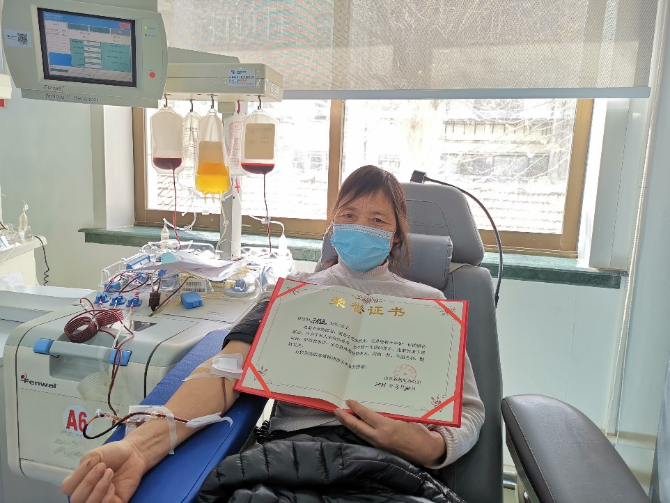 第一次献血,还要追溯到2005年1月25号,于桂兰老师的爱人手术急需用血,于是就跟儿子第一次走上采血椅,身体没有什么不适。“献血对自己没有影响,却能救别人,这样的事让人心里舒服!”献血的念头在于老师心里悄悄地发芽,在她的影响下儿子刘永也成功献血近百次。家住章丘的于老师,每次献血都要坐车接近两个小时才能到血液中心,可是她从来不叫苦不叫累,始终抱着“我的血液是可以救人的”的信念,一坚持就是16年。“我加入这个队伍晚,我就想如果能坚持无偿献血到退休年龄就好了,现在我坚持到了60岁的年龄上限,很感恩也很知足。”于桂兰说,“虽然以后自己不能献了,但儿子还可以,我儿子的孩子也可以,我会继续宣传无偿献血,做好志愿服务,让大家认识到献血是一个对自己、对家人、对社会都有益的事情。”