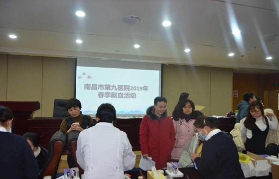 2月15日上午,南昌市第九医院2019年春季无偿献血活动在医院学术报告厅举行。寒冷的天气阻挡不了职工们献血的热情,在医院党委书记吕定英的带领下,来自全院各科室的职工纷纷参加无偿献血,大家用满腔热血传递着爱与奉献的力量。