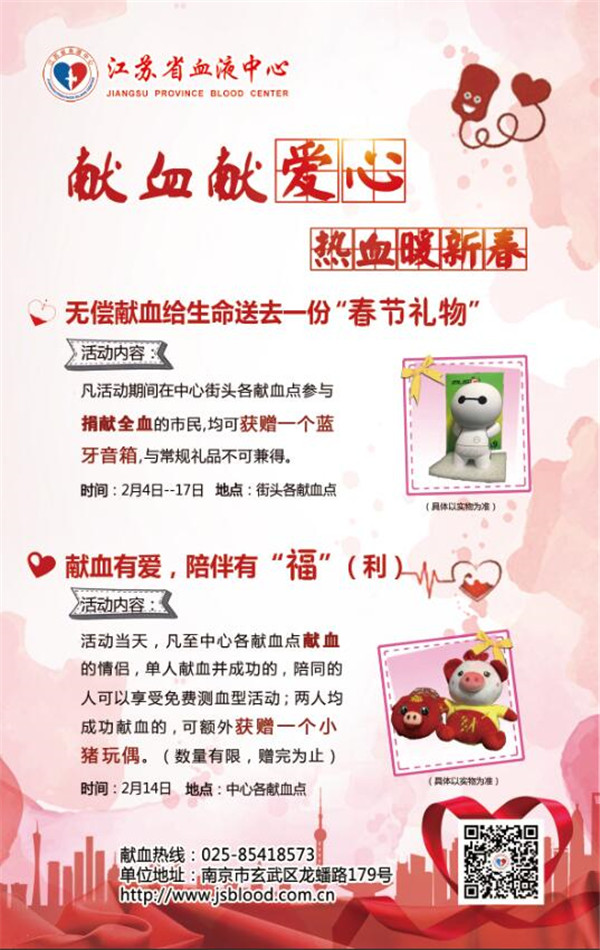爆竹升天送狗岁,春花遍地缀猪年。为庆祝新春,江苏省血液中心组织策划了“献血献爱心 热血暖新春”系列活动,希望在节日期间参与无偿献血的市民,可以在奉献爱心的同时,感受到中心充满诚意的祝福。