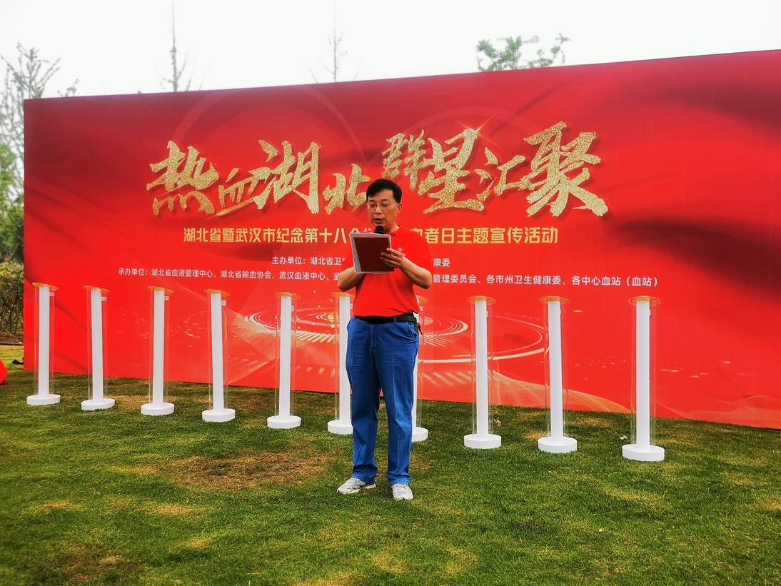 活动中,来自宜昌枝江市仙女镇财政所的杨军,作为宜昌先进代表上台进行了发言。2002年,杨军开始了他的第一次献血,此后从未间断,截至2021年6月,已经累计献血37次14600毫升。他不仅坚持自己献血,还带动了家人献血。杨军表示,献血是一件微不足道的事情,但这样一个小举动也许能换来一个生命的延续,就是天大的好事。他认为整个社会需要这样的正能量,所以只要身体和年龄允许,就会一直坚持无偿献血,并且呼吁更多人加入到无偿献血行列。