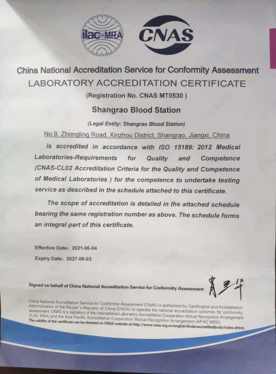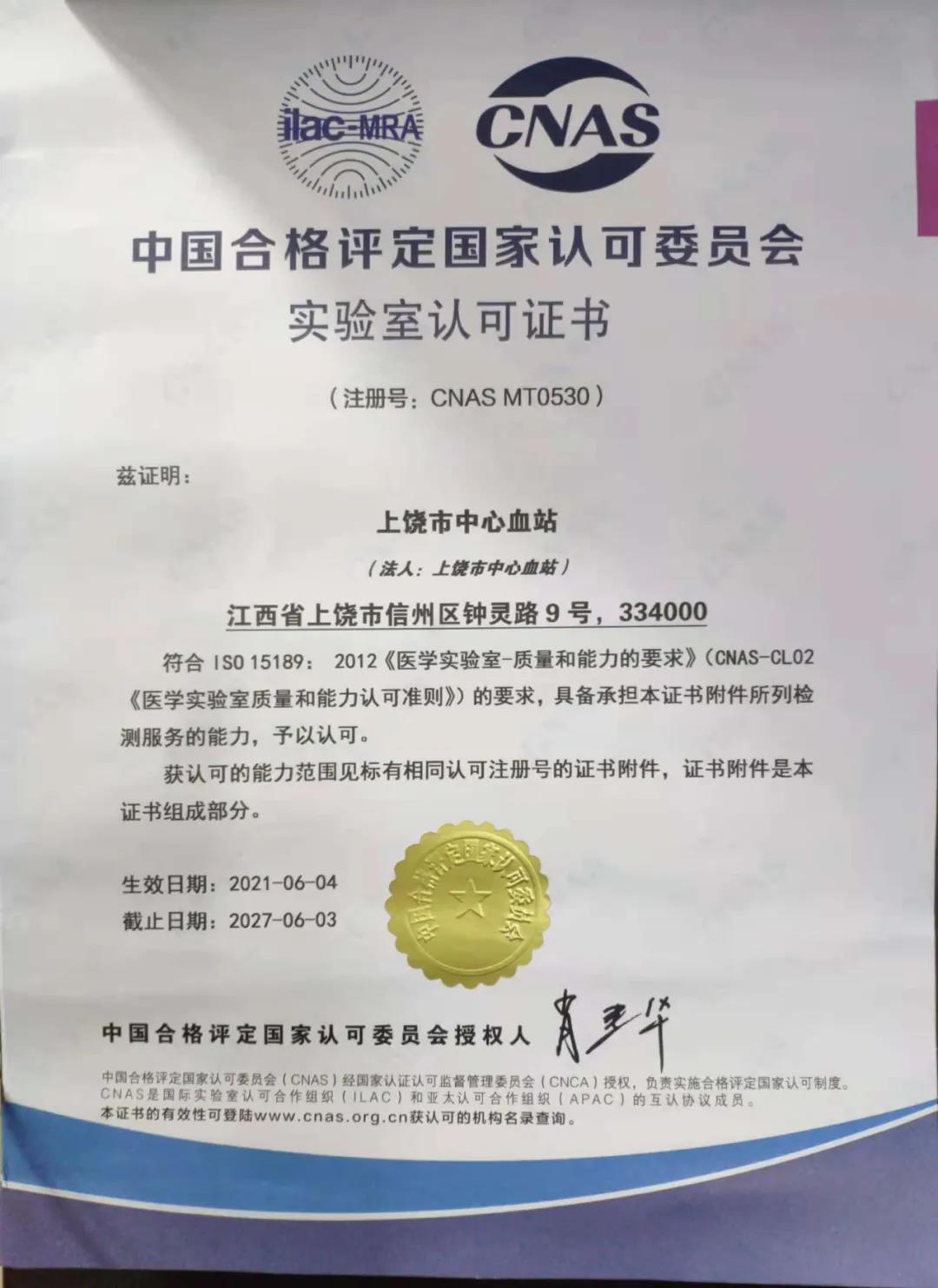 中国合格评定国家认可委(CNAS)系国际实验室合作组织(ILAC)在医学检测实验室和检验机构领域互认协议(MRA)的签署方,通过了中国合格评定国家认可委(CNAS)认可,标志着上饶市中心血站实验室检测水平与国际标准接轨,同时有力推动实验室质量管理的持续改进,提升学科核心竞争力,提高行业影响力。市中心血站出具的检测报告,可以得到全球一百多个国家和地区通过国际实验室合作组织(ILAC)签署方认可的医疗机构互认,即检验结果的国际互认互通。