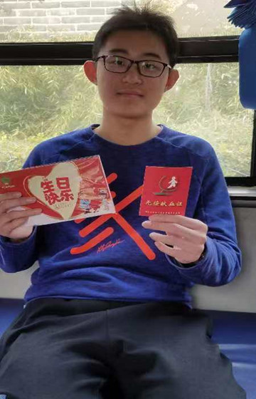 济宁一中高三的学生上官福凯今天跟随妈妈张宏一起来到献血车上。 "18年前的今天父母赋予了我生命,18年后的今天我将有机会给需要血液的病人延续生命 。奉献爱心来完成我的成人礼,也不失为另一种美妙,献血证-----是给自己最好的生日礼物"。上官福凯如是说。福凯的妈妈是献血车的一名工作人员,更是一名无偿献血者,由于受妈妈的影响及从小的耳濡目染,福凯对血液在临床急救中的重要性有着深刻的认知,对献血常识也有着充分的了解,所以他对献血没有恐惧,能坦然面对采血穿刺时的疼痛,整个献血过程福凯始终面带微笑。吹蜡烛,吃蛋糕,宴请亲朋是大多数人过生日的方式,福凯选择一种特殊的方式无偿献血,完成更有意义的18岁成人仪式。