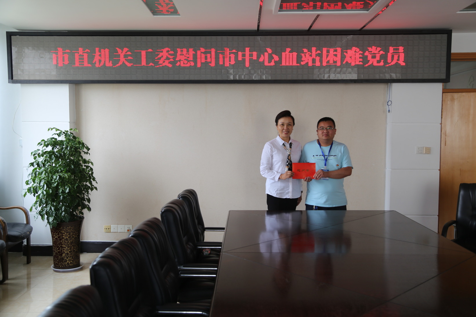 6月25日,为充分体现资阳市委、市政府对困难党员的关怀和爱护,市委常委、秘书长周燕、市直机关工委周燕专程到市中心血站看望慰问困难党员。