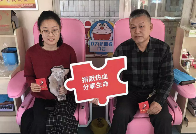 固定献血者张美平带着刚满十八周岁的女儿挽袖献血