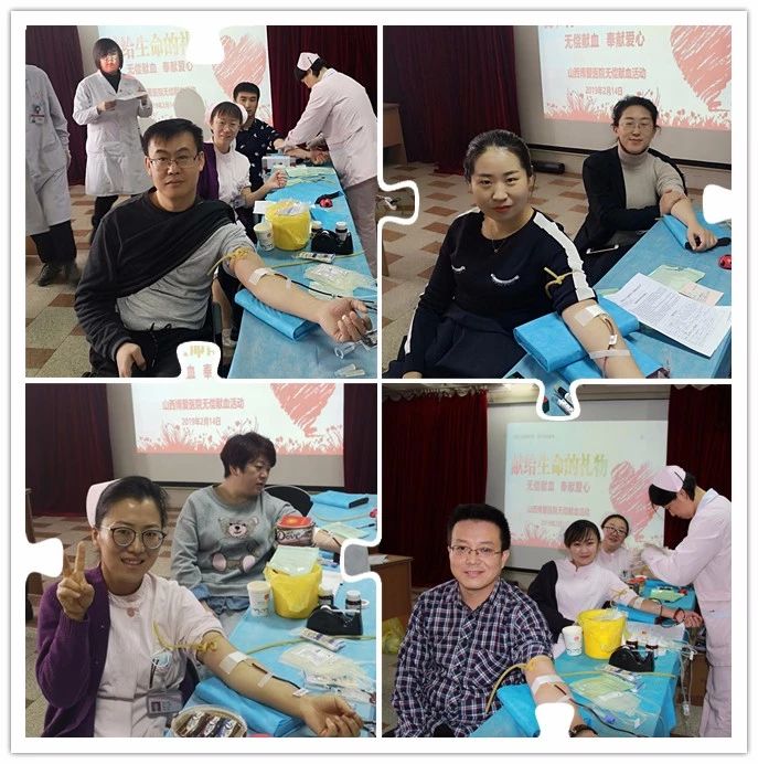 2月14日,山西博爱医院组织团体无偿献血活动,多名医务人员积极挽袖捐献热血,在他们的脸上,洋溢着温暖的笑容,他们仿佛看到这一袋袋血液将会给患者带去生存的希望。在这个血库库存偏低的时间,