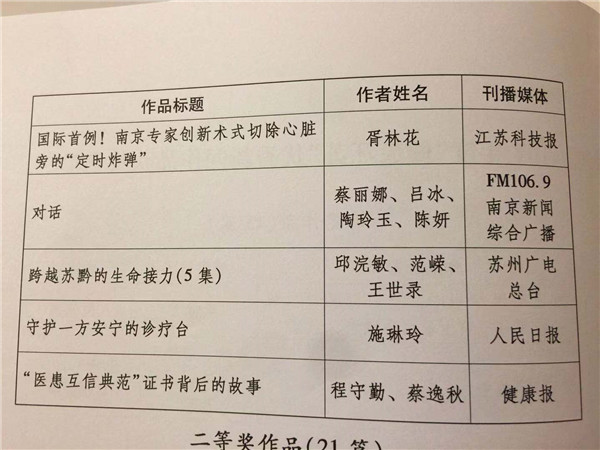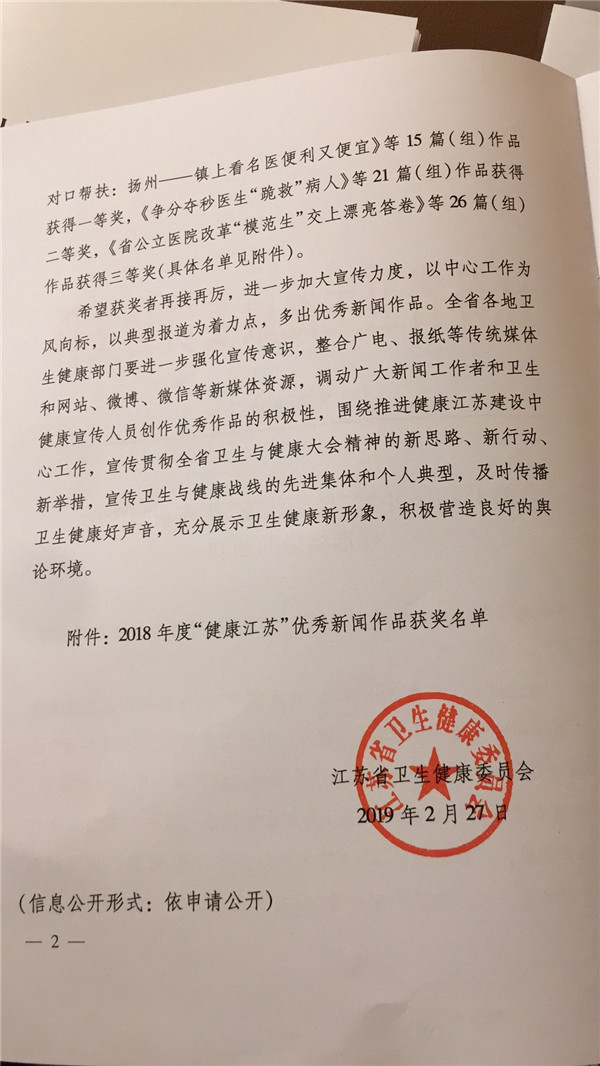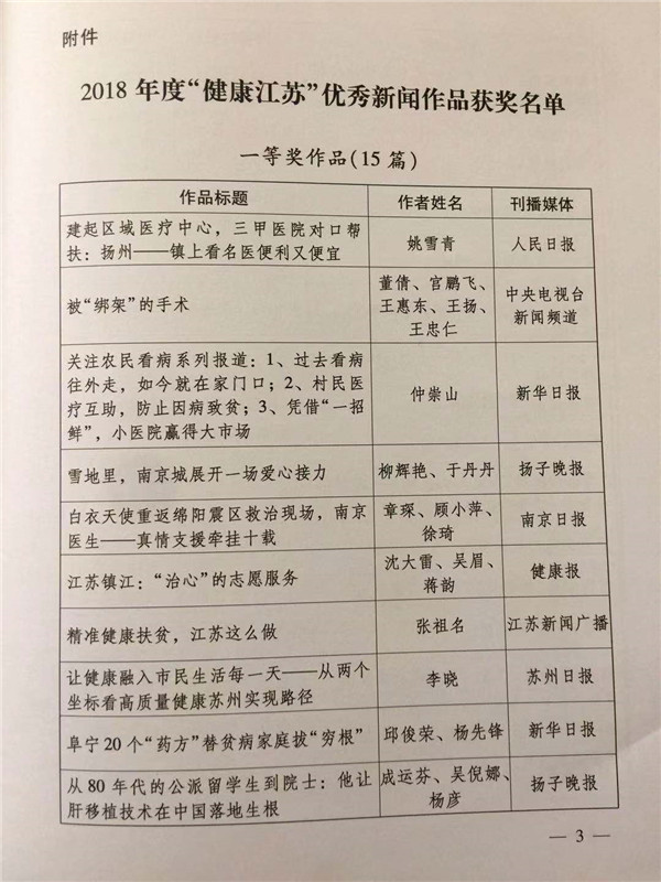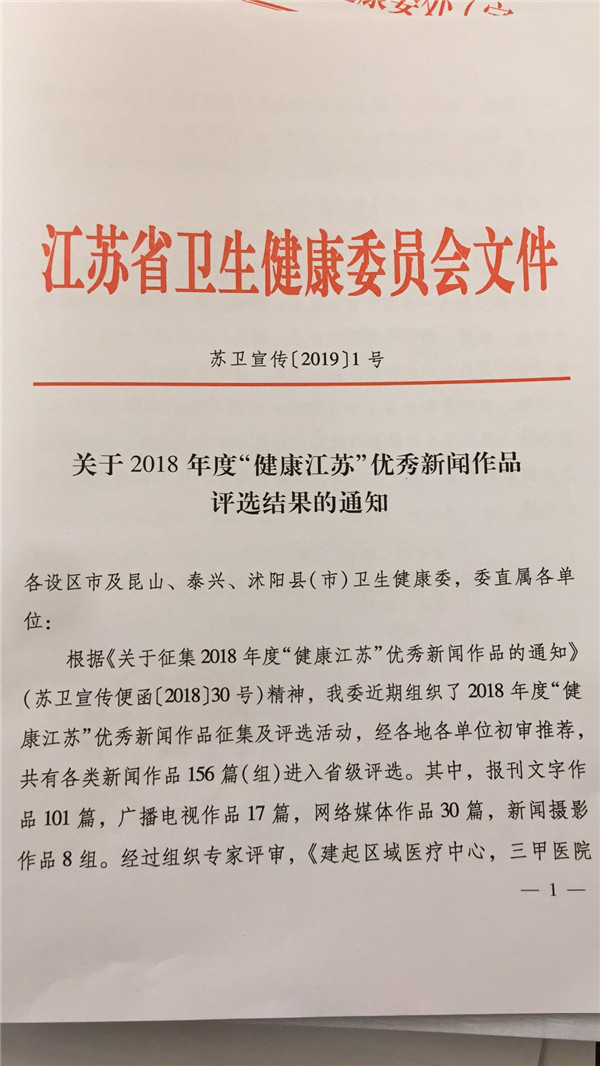根据江苏省卫健委文件《关于2018年度“健康江苏”优秀新闻作品评选结果的通知》(苏卫宣传〔2019〕1号),江苏省血液中心广播作品《对话》(蔡丽娜、吕冰、陶玲玉、陈妍)荣获一等奖。