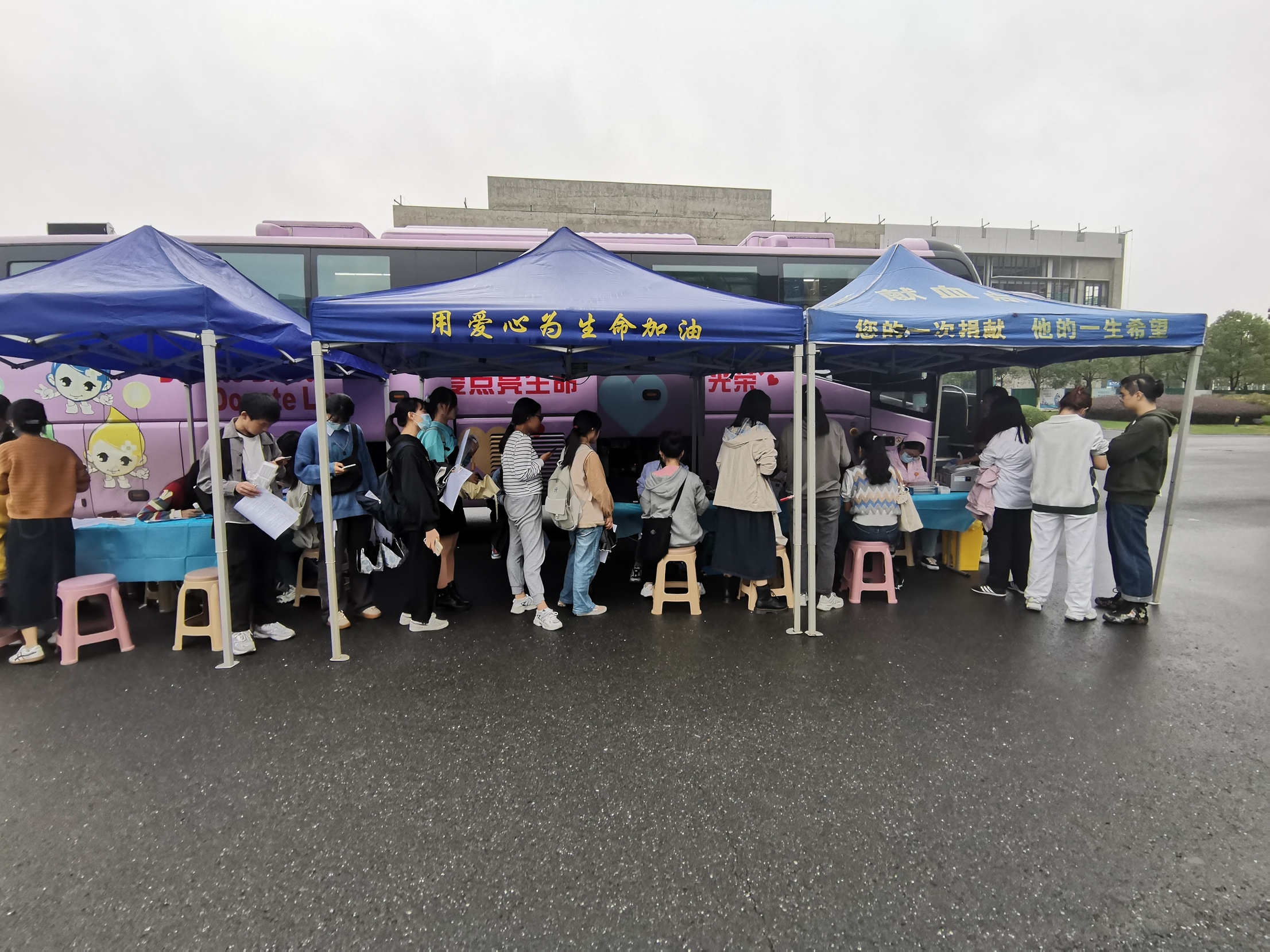 一早,在合肥学院食堂和图书馆门口,就已经排起长队开展献血活动了。同学们都积极参与,在志愿者工作人员的指导下,按照流程有序地进行体温检测、填表询问、初筛检查,血液检验合格后即开始无偿献血。
