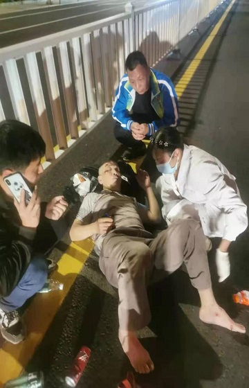 “旁边路上发生车祸了,快点去看看!”南山桥献血点的工作人员听到这个消息,第一时间投入紧急救援,在120救护车尚未到来之前对伤员进行初步检查判断,对伤口进行相应的紧急处理。