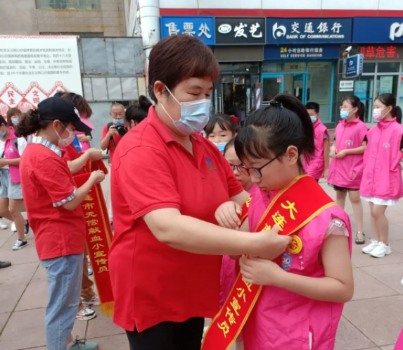 仪式结束后,新老队员一起在献血屋前广场为行人派发宣传册,讲解血液。有4位家长走进献血屋,成功捐献血液1600毫升。大连市金普新区青少年宣传队成立3年多,宣传成绩斐然。2020年,感召40多人参加无偿献血,献血量达10000多毫升。